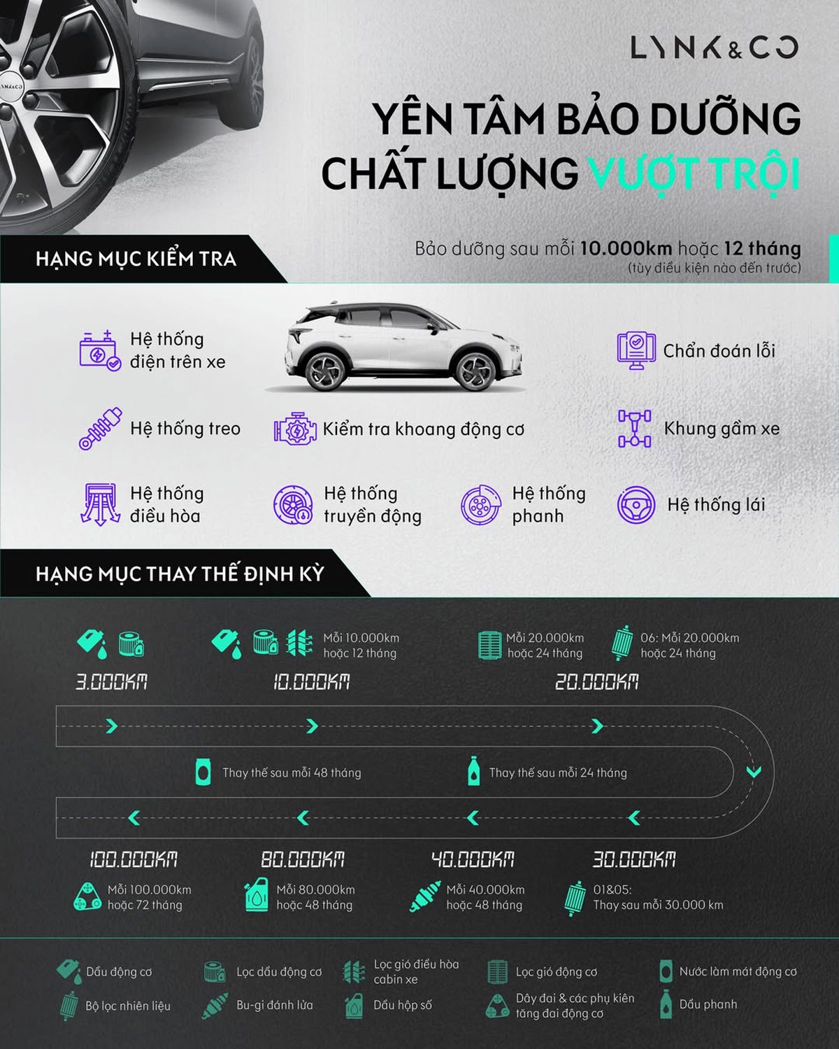 Cùng ghi nhớ các mốc bảo dưỡng và hạng mục thay thế định kỳ cùng Lynk & Co nhé!