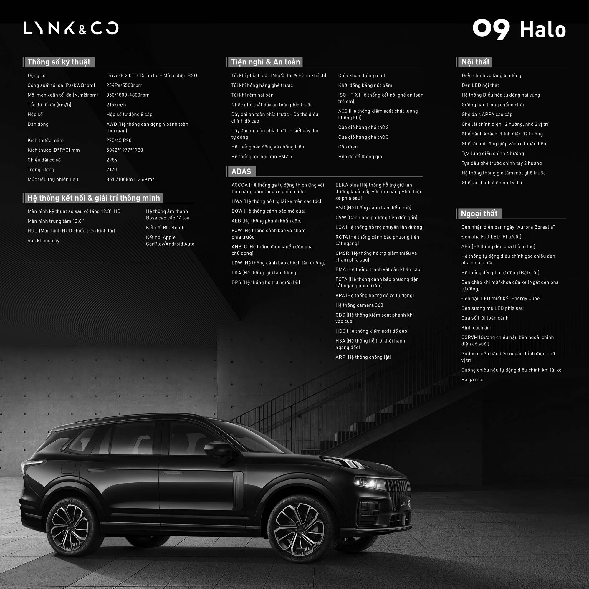 Lynk & Co 09 ấn tượng với sự chỉn chu từ thiết kế ngoại thất đến nội thất từ bộ đèn nhận diện thương hiệu Aurora Borealis với hệ thống đèn Full Led “Adaptive Matrix Led” 84 nguồn sáng độc lập hiện đại, tay cửa được thiết kế ẩn sang trọng. Nội thất rộng rãi, được chăm chút từng chi tiết với 3 hàng ghế bọc da Nappa cao cấp, cửa sổ trời toàn cảnh và 6 màn hình thông minh kết nối Apple Carplay, Android Auto, Táp-lô bọc da mềm cao cấp và ốp nhôm công nghệ cao được chạm khắc tinh tế. Khả năng vận hành ấn tượng nhờ động cơ 2.0L tăng áp công suất 254 mã lực, hệ thống dẫn động 4 bánh toàn thời gian AWD, cùng hệ thống an toàn và hỗ trợ lái nâng cao 23 tính năng (ADAS) là lời khẳng định điềm nhiên về đẳng cấp thực sự mà Lynk & Co 09 mang lại.